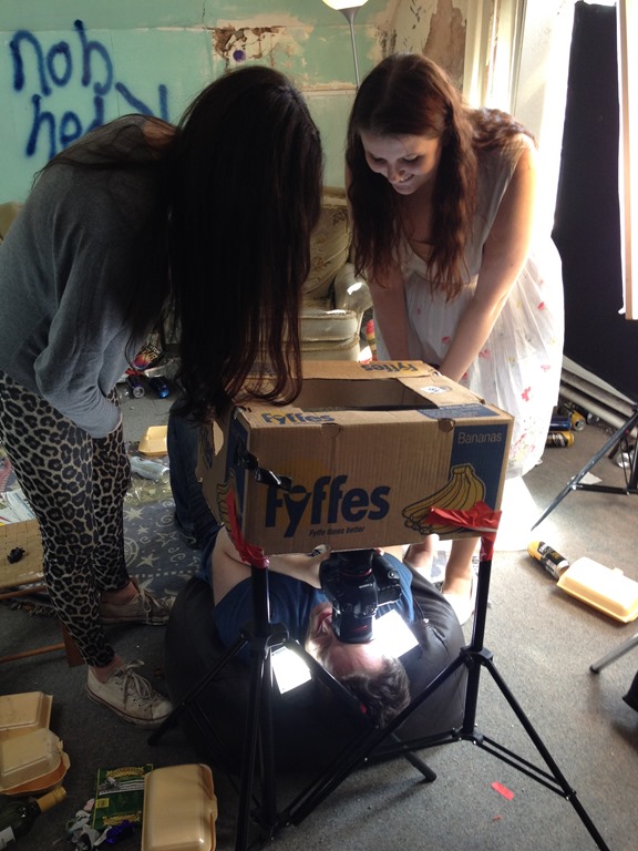 Here we’re getting ready to shoot the pub scene. I can’t quite remember why Matt or DOP was filming two of our crew through a banana box.